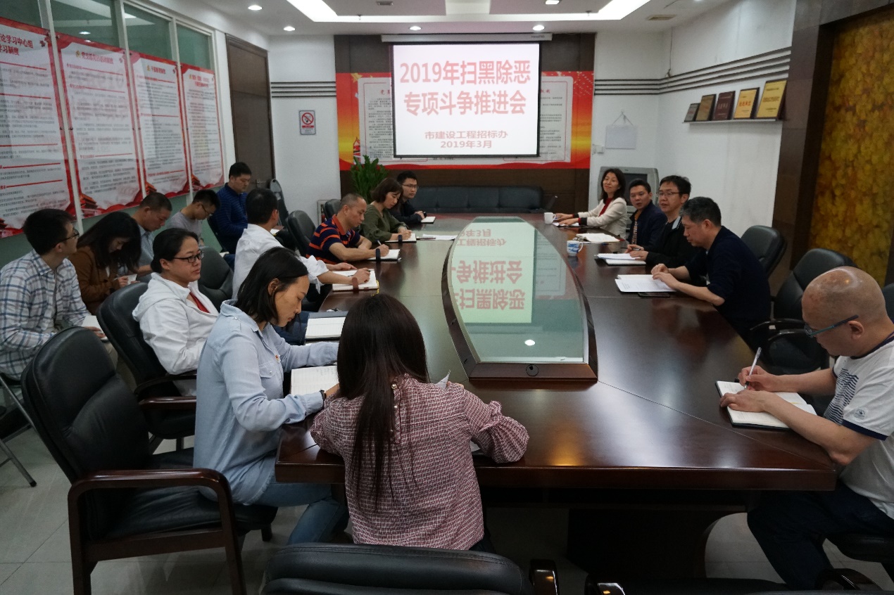 3月20日,市建設(shè)工程招標(biāo)辦召開2019年掃黑除惡專項(xiàng)斗爭(zhēng)推進(jìn)工作會(huì)議,全體干部參加會(huì)議。會(huì)議傳達(dá)學(xué)習(xí)了省市掃黑除惡專項(xiàng)斗爭(zhēng)有關(guān)會(huì)議精神及市住房城鄉(xiāng)建設(shè)局2019年掃黑除惡工作要求,安排部署了下一階段工作。