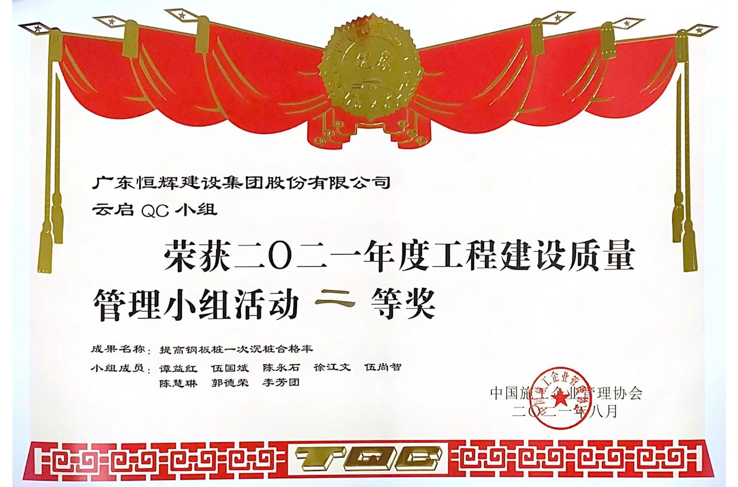“廣東省工程建設(shè)優(yōu)秀質(zhì)量管理小組二等獎(jiǎng)、三等獎(jiǎng)”、“廣東省市政工程建設(shè)優(yōu)秀QC小組二等獎(jiǎng)、三等獎(jiǎng)”“廣州建設(shè)行業(yè)質(zhì)量管理小組活動(dòng)二等獎(jiǎng)、 三等獎(jiǎng)”以及“廣州建設(shè)行業(yè)QC小組活動(dòng)優(yōu)秀企業(yè)”等幾十項(xiàng)省級(jí)市級(jí)榮譽(yù)證書。